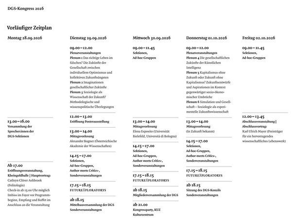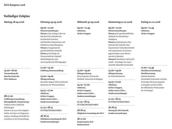 Unter dem Titel ›Zukünfte der Gesellschaft‹ erwartet Sie ein vielfältiges wissenschaftliches Programm mit Plenar- und Sektionsveranstaltungen, Keynotes und neuen Formaten. Im Vorprogramm finden Sie alle wichtigen Informationen zu Themen, Formaten, Terminen und Beteiligten. Es handelt sich um ein vorläufiges Programm; Änderungen bei Uhrzeiten, Räumen und Slots sind möglich. Das offizielle Hauptprogramm erscheint im Sommer.